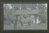 "Albert Pettersson med familj, Nilslund, Fogelstad." En familj framför sitt hus, mannen i förgrunden håller en häst.