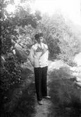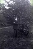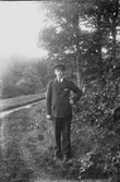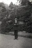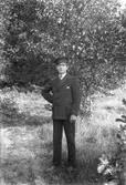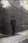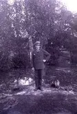 En äldre man går med käpp och en yngre man står med en häst framför härbre. Häxmo Ådalsliden