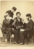 Gruppfoto av några beväringar i sällskap med tre unga damer.