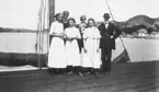 Tidigare hängdes lättare tvätt på särskild torkplan i land. I bakgrunden skymtar Ängö. Föreståndaren Hjalmar Rosengren står framför klapphuset.
