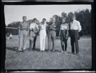 Porträtt av en grupp unga män ute på en gata. De ser ut att vara på väg att resa: ett par av dem sitter på resväskor, en håller en resväska i handen och en annan bär ett par skor.
