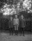 Fyra pojkar ute i snötäckt skog på längdskidor, tidigt 1900-tal.