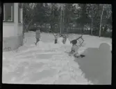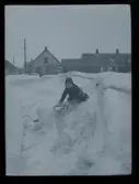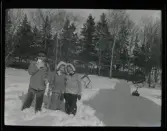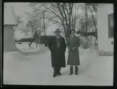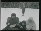 Två män sitter i djup snö i ett skogsparti vintertid. De bär mörka ytterrockar och skärmmössor. Männen sitter tätt intill varandra med armarna om varandra. Omgivningen utgörs av vissna lövträd och snötäckt mark. Bilden är tagen i naturligt ljus och har karaktär av amatörfotografi. Troligen från 1910-1920 tal.