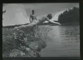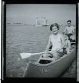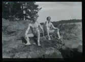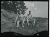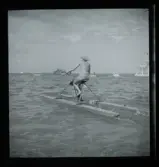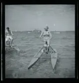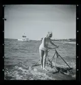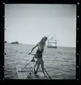 Man i shorts och kortärmad skjorta med mönster av växter och fiskar. På huvudet en kakhihatt. Solglasögon. Text med blyerts på baksidan: "Div. utställning California maj 1947"