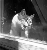 Eva Svensson Johansson, dotter till ägaren Rolf Svensson och katten Nalle är utanför Ekan 1:1 år 1953.