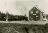 Flygfoto över stationen i Insjön. Framför spårområdet syns Clas Ohlssons kontorsbyggnad.