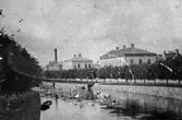 Vinet skall, 3 augusti 1965. I samband med ett besök från Cresia i Italien togs bilden från Engelbrektsgatan. Två damer promenerar under lindarna längs Svartån i riktning mot Storgatan och slottet.