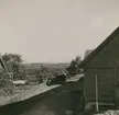 Motiv från Högsby. Ett garage och släpvang. En vägbro i bakgrunden.