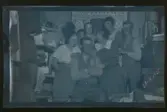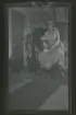 "Vid Tegelbruket." Ett sällskap poserar i ett rum, möjligen Axel Fredrikssons (som sitter längst fram i mitten) arbetsrum.