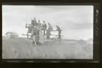 "Karl Pettersson, Gustav Larsson med anhang" Ett sällskap sitter ute på en gärdsgård och en vedstapel.