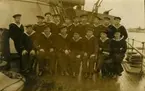 Enl. tidigare noteringar: "Ombord på fraktbåten "Hjalmar" år 1915 i Västerås hamn. Fr v: Ivar Alfredsson bror till Karl A Ögård, okänd person, Karl A Ögård, okänd person. Repro 1985 av foto tillhörande Thore Ögård, Kungshamn".