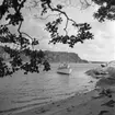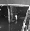 Boskapspråm uppdragen på en strand. Två kor betar i strandlinjen.