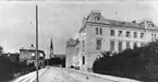 Skara. Järnvägsgatan från Skaraborgsgatan. Stadshotellet till vänster o Skara Domkyrka i fonden. Fotot taget från järnvägsstationen före 1904.