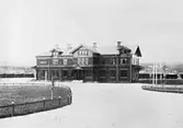 Vy på stationsbangård under vintertid med lok och vagnar i bild och stationshus i bakgrunden.