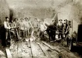 Edet. Fr.v: 1. 2. Fritiof Karlsson, Närlunda, lokförare 3. David Karlsson, Myrhult, eldare 4. Rickard Nilsson, Edet, förman 5. Gustaf Pettersson 6. Verner Karlsson, Tjärbruket 7. Frans Svensson ("Bussa-Frans") 8. Oskar Borg, Skagen