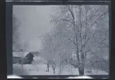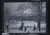 Två barn leker i snön på tomten till familjen Morthensens villa Solveden, Djursholm.