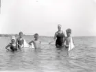 Ett gäng badande, de flesta okända. Ingeborg Malmberg till höger och Lisa Olsson bredvid henne, resten okända.