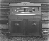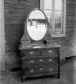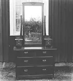 Rokokobyrå av mörkt träslag med mässingsbeslag, tre lådor och utfasat mittenparti. Gunnebo slott 1930-tal.
