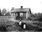 "Fredriksberg", Dalmursvägen 12 i Västerhästbo, Torsåker. En man och två kvinnor framför ett bostadshus.