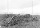 Klumpstenar och hällar över en hällkista. I bakgrunden syns smedjan.