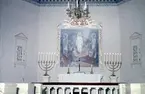 Familj firar jul med läsning av julevangeliet vid julgranen. Västerås.