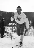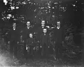 "Vid kullen i Ulvatorp." Sex unga finklädda män och pojkar står vid en hög stenmur i skogen.