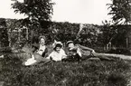 "Det glada 90-talet". Apotekare K.H. Rydberg på Vallen, Telestad, ca 1900. Man har slagit sig ner på en gräsmatta med en trädgårdsfigur i form av en tomte framför sig.