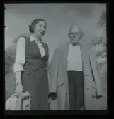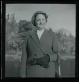 Nordiska Kompaniet. Kvinna i ljus kappa med vida ärmar. Mörk kjol. Mörk hatt med fjäder. Text på baksidan: "Bruyère 1948"