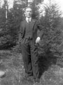 Jobbet och vi, Snickerifabrik 18 maj 1965 En man i kostym som ligger på backen vid en skogsdunge.