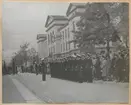 Bilden visar Norges överbefälshavare som kliver ombord på pansarskepp Sverige.