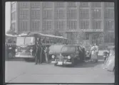 Grupp står vid Volvo PV-personbil, Intendenturfältövning våren 1957.