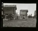En samisk man framför sin bostad. Ovan dörren hänger en handmålad tavla med finsk text: "Iloinen sydän ja rauhaisakoti on elämän onni"