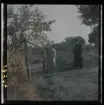 1950. Frankrike. En kvinna bärandes ett bylte och en korg kommer gåendes längs en stig med en hund i sällskap.