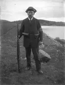 Kung Gustaf V lämnar Arbogautställningen tillsammans med utställningens ordförande Sven Lind. Konungen är i Arboga med anledning av Riksdagens 500-årsjubileum och gästade Arbogautställningen samtidigt.