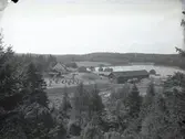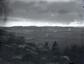 Vägstation N2, Skedala. Utsikt över åkerlandskap. Byggnader i fonden. Eventuellt utsikt från vägstationens grusgrop.