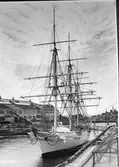 Bilden visar skeppsgossefartygen Jarramas och Najaden till ankars på Malmö redd år 1900. Fartygen har hissat unionsflaggan i mitten och norsk flagga i fören.
