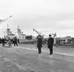 Sittande till höger är riksmarskalken, amiral Stig H:son Ericson, dopförrättare av torpedbåten Västervik. Stående är generaldirektören för försvarets materielverk, generallöjtnant Ove Ljung.