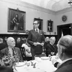 En rad av män sitter ned vid ett dukat middagsbord. Kommendörkapten Lind af Hageby (andra från höger) och konteramiral Berthelsson (i mitten) klädda i uniform.