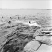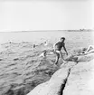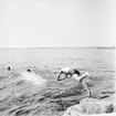 Simhopp från navigationshyttens tak på hjälpvedettbåt 384. Fotografiets togs under fil lic Gunnar Jonssons undersökningsresa till Västkusten i juni 1940.