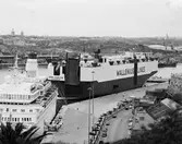 Utställningsarbetet med nya handelssjöfartsutställningen. Göran Forss monterar vid en fartygsmodell av ett Wallenius-biltransportfartyg.