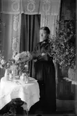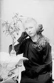 Porträtt av en ung kvinna i ljus klänning som står lutad mot en piedestal med blomvas.