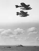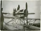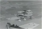 Finska flygbåtar på besök vid Flygverkstäderna på Galärvarvet 1925. I bakgrunden till vänster syns galärskjul 17, där flygingenjörerna hade kontor. I mitten syns flygverkstäderna och till höger hangarer. I bakgrunden Nordiska museet