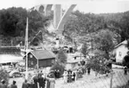 Vy från byggandet av Ölandsbron. Här har de första pelarna på fastlandssidan gjutits färdiga och man firar med tårta.