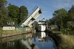 Rödesund. Parti från Göta kanal. Passagerarbåten Wilhelm Tham passerar. I bakgrunden brovaktarstugan. Neg. finns.