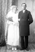 Ett porträtt av ett brudpar. I bakgrunden står det bord och stolar.