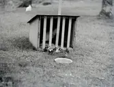 Dokumentation av Falu rödfärg. Tappningslinje "Nya-kokeriet". T h. matningsbana, tomburkar, fyllning, vägning, lock påsätts och datumstämpling. Allt görs automatiskt. Närmast kameran en "Robot" för pallastning av burkar på SJ-pallar. Burkarna ställs i tre rader.