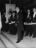 Uppsala Studentkår "tågar fram till uppvaktningen för jubeldoktorerna", utanför Universitetshuset
