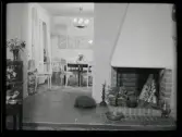 513 G Hos Runar Karlströmer i Hälsingborg. En kvinna sitter på golvet framför en kakelugn och lutar sig mot ett gnistskydd.