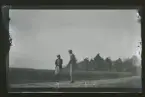 "Gunnar Johansson börjar fria så smått till Iris vid Fogelstads hönshus, då var Axel påpasslig." En kvinna och en man står på en väg längs ett fält.