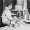 Stockholms stads handelsskolas övningsbutik. Biträdet Maja Hannu expedierar Lars Kulin. I butiken får eleverna lära sig försäljningsteknik, bokföring, skyltning och ett vårdat språk.